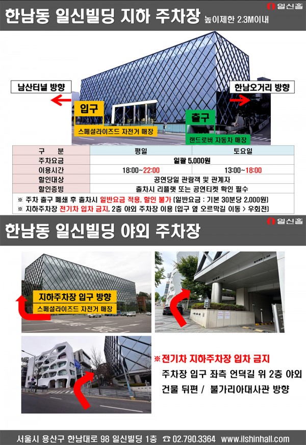 주차장 이용 및 금액은 어떻게 되나요? 페이지 정보 작성자 일신홀 작성일18-05-31 11:30 조회28,839회 댓글0건 관련링크 이전글 다음글 목록 본문 주소 : 서울시 용산구 한남대로 98(한남동 714) 일신빌딩 1층 Tel : 02-790-3364 이전글 다음글 목록